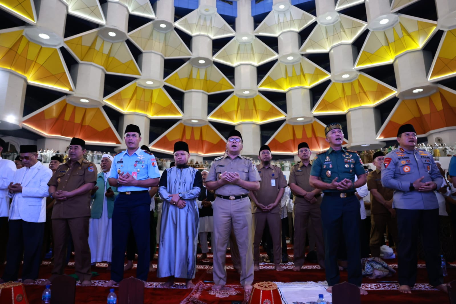 BN Online, Makassar,- Wali Kota Makassar Moh Ramdhan Pomanto bersama Pj Gubernur Sulsel Bahtiar Baharuddin, Pangdam XIV Hasanuddin Mayjen TNI Dr. Totok Imam Santoso dan Kapolda Sulsel Irjen Pol Drs. Setyo Boedi Moempoeni Harso mengikuti kegiatan Sulsel Bersalawat dan Salat Magrib berjemaah di Masjid 99 Kubah, Kamis, (5/10/2023).
