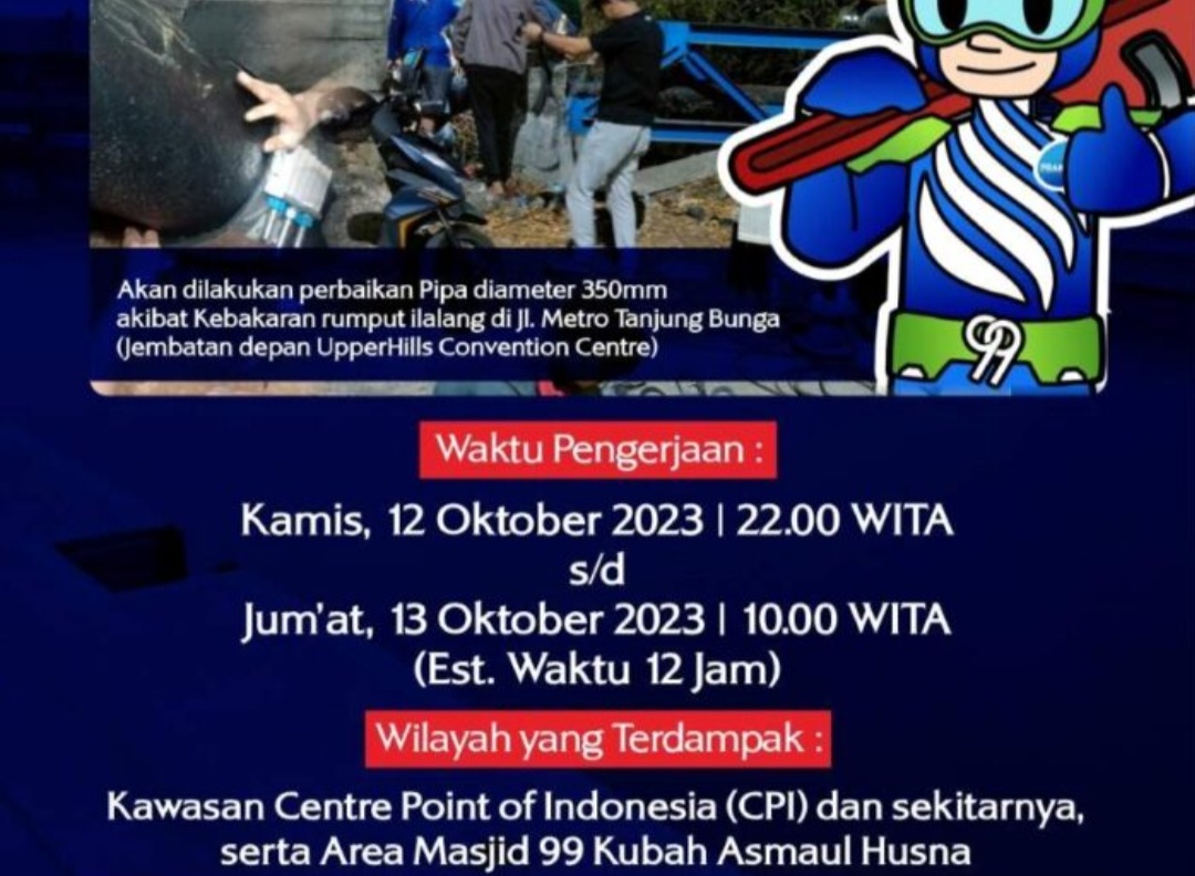 “Estimasi waktu pengerjaannya selesai siang Jumat ini,” kata Kabag Humas PDAM Makassar, Muhammad Idris.