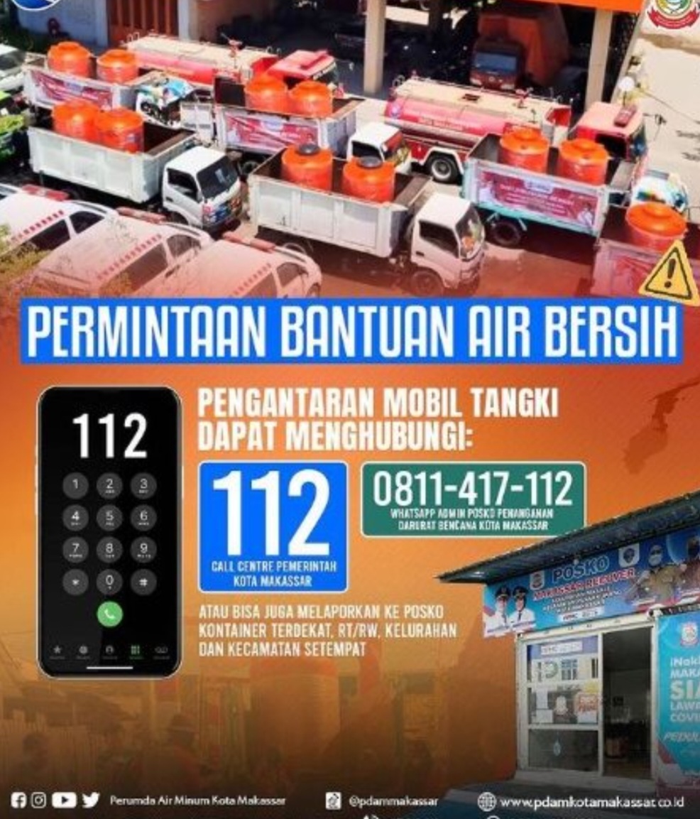 Pada akun Instagram resmi Perumda Air Minum Kota Makassar, Selasa (17/10/2023), menyampaikan, permintaan bantuan air bersih untuk pengantaran mobil tangki bisa menghubungi:
