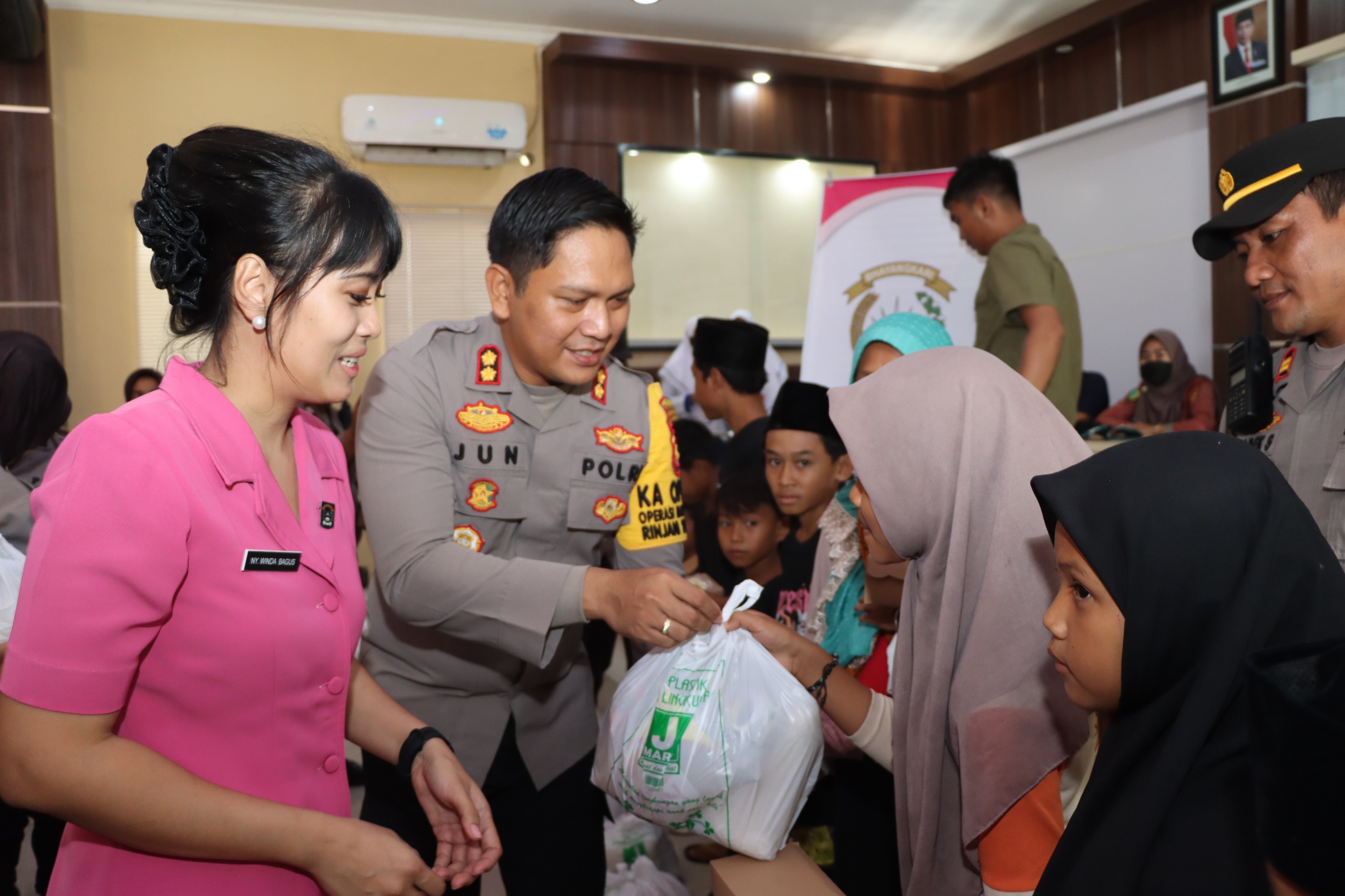 Dalam kegiatan Bakti Sosial, Kapolres Lombok Barat didampingi Ketua Bhayangkari Cabang Polres Lombok Barat memberikan bingkisan. Berupa sembako, pakaian, dan uang tunai kepada anak yatim piatu dan Lansia.