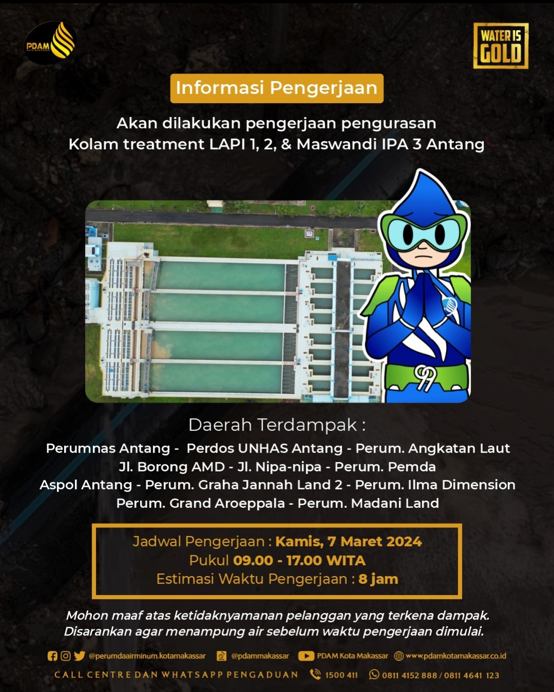 Rencananya, Perumda Air Minum Kota Makassar, akan melaksanakan pengerjaan hari Kamis (07/03/2024), pukul 09.00 – 17.00 Wita, dengan estimasi waktu pengerjaan 8 jam.