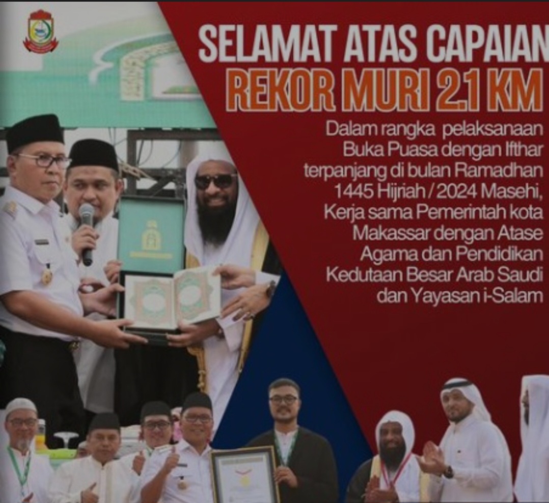 BN Online, Makassar – Kota Makassar mencatatkan prestasi gemilang dengan meraih rekor MURI untuk Buka Puasa dengan Ifthar terpanjang sejauh 2,1 kilometer dalam bulan Ramadhan 1445 Hijriah/2024 Masehi, pada Rabu (13/3/2024).