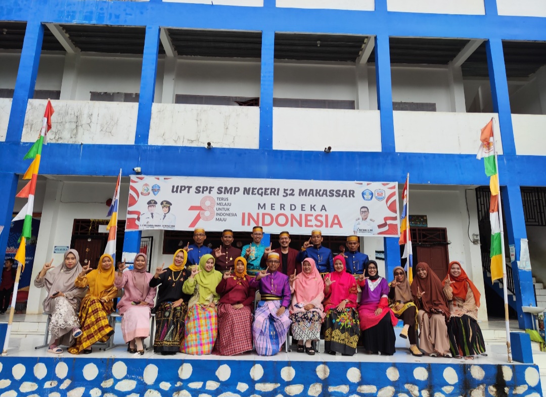 Diantaranya seperti yang terlihat pada sekolah UPT SPF SMPN 52 Makassar. Para guru, pegawai dam siswa siswi disana kompak mengenakan pakaian adat yang berbeda beda, baik itu pegawai wanita dan pria, besrta siswa siswi UPT SPF SMPN 52 Makassar.