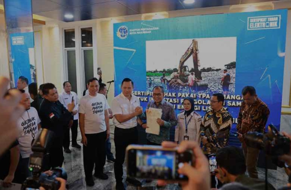 BN Online, Makassar—Menteri Agraria dan Tata Ruang, Agus Harimurti Yudhoyono memberikan secara langsung sertifikat elektronik hak pengelolaan Karebosi dan 6 bidang tanah lainnya kepada Pemkot Makassar.
