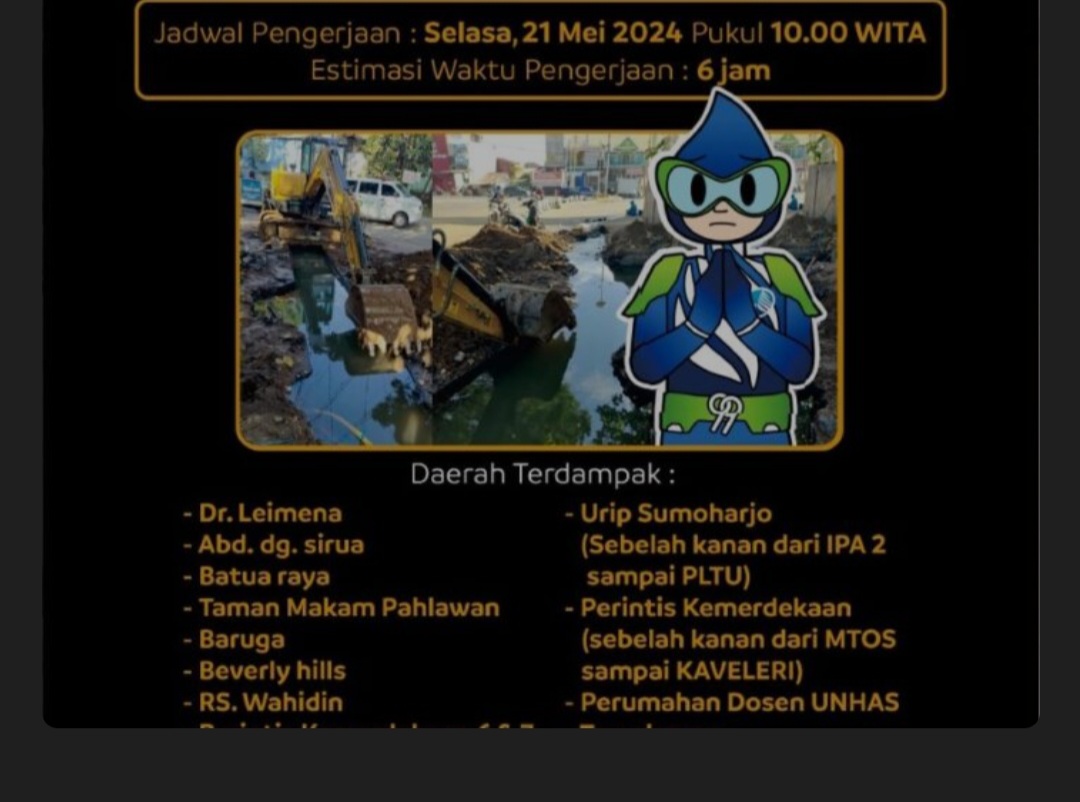 “Jadi selama proses pengerjaan berlangsung debit air akan berkurang. Dan disarankan pelanggan agar menampung air sebelum waktu pengerjaan dimulai. Kami dari PDAM Makassar meminta maaf atas ketidaknyamanan pelanggan yang terkena dampak,” jelas Idris Tahir.