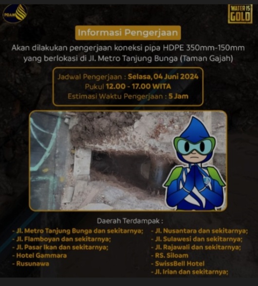 BN Online, Makassar – Pengerjaan koneksi pipa HDPE berdiameter 350mm hingga 150mm akan dilakukan di Jalan. Metro Tanjung Bunga, tepatnya di Taman Gajah, Senin (03/06/2024).