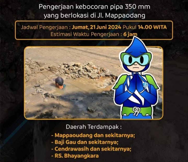 “Selama proses pengerjaan berlangsung, debit air akan berkurang. Mohon maaf atas ketidaknyamanan pelanggan yang terkena dampak. Disarankan agar menampung air sebelum waktu pengerjaan dimulai,” terang PDAM Makassar dalam postingannya.
