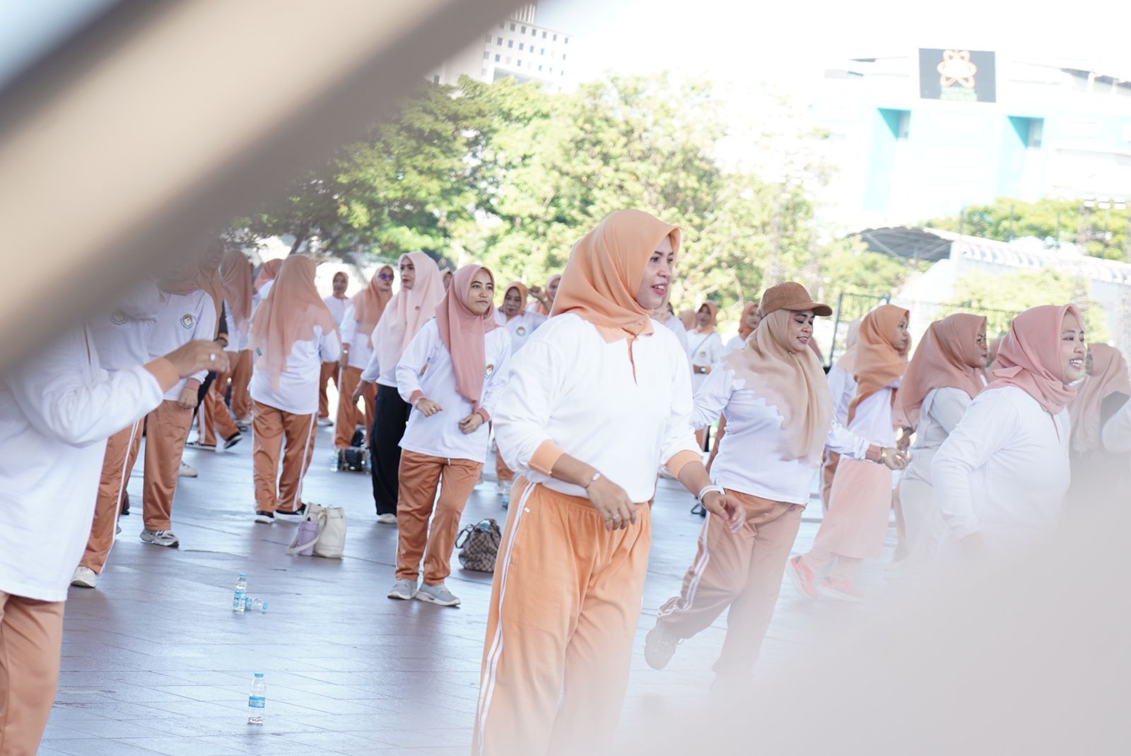 Pj Ketua DWP Kota Makassar, Fadliah Firman, turut serta dalam senam bersama anggota dengan penuh antusias.