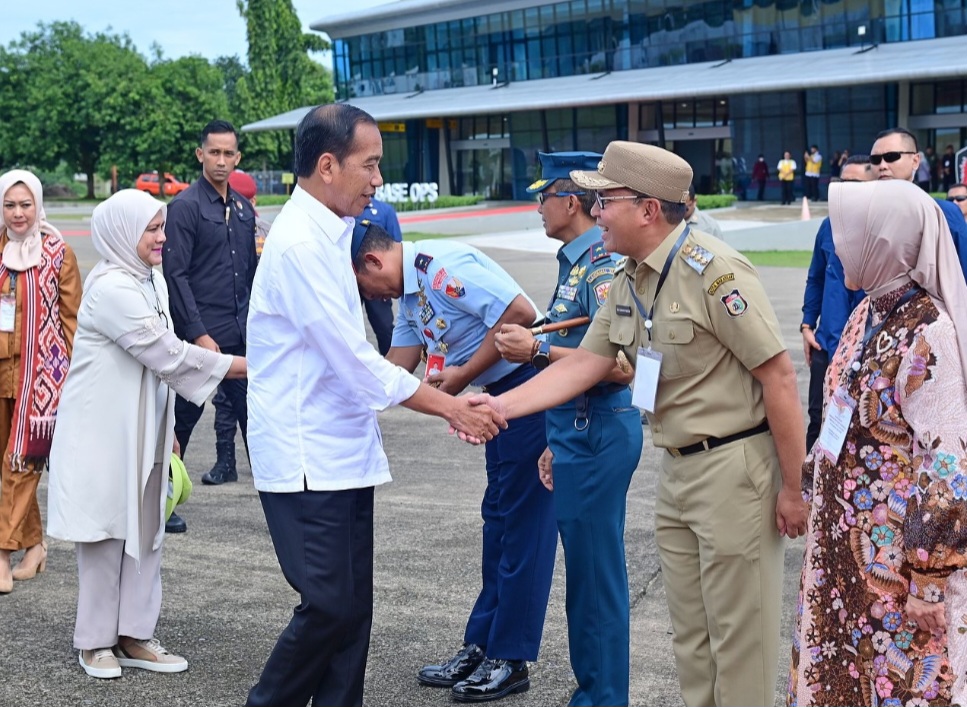 BN Online, Makassar – Wali Kota Makassar Moh Ramdhan Pomanto bersama Ketua TP PKK Kota Makassar Indira Yusuf Ismail menyambut kedatangan Presiden Republik Indonesia Joko Widodo bersama Ibu Negara Iriana Joko Widodo di Lanud TNI AU Sultan Hasanuddin, Kabupaten Maros, Kamis (4/7/2024).