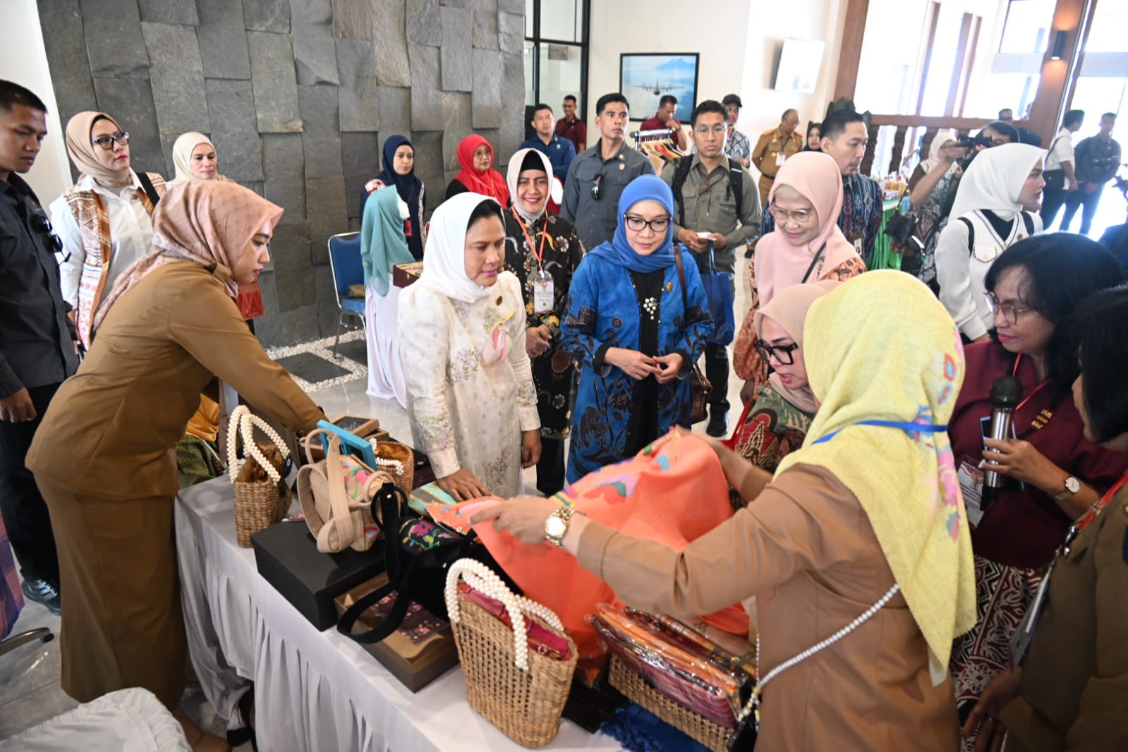 BN Online, Makassar,- Ketua TP PKK Kota Makassar Indira Yusuf Ismail memperkenalkan produk-produk unggulan UMKM Kota Makassar di hadapan Ibu Negara Iriana Jokowi dan Ibu Wakil Presiden Wury Ma’ruf Amin, Senin (22/7/2024).