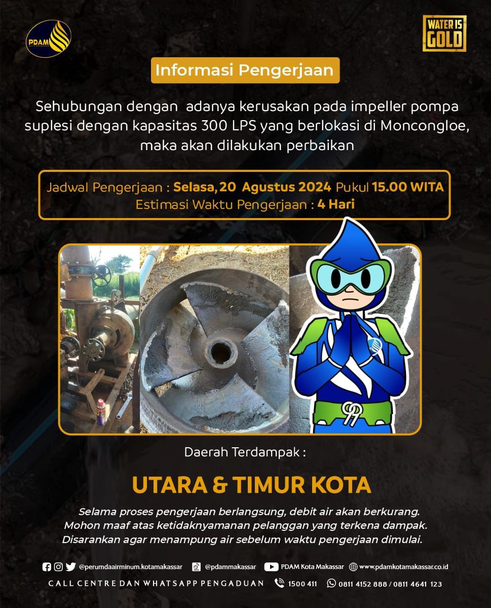 BN Online, Makassar-–Perusahaan Daerah Air Minum (PDAM) Makassar kembali melakukan perbaikan atas kerusakan pada Impeller Pompa Suplesi dengan kapasitas 300 LPS yang berlokasi di Moncongloe, Kabupaten Maros.Ini akan berdampak pada warga yang bermukim di Makassar bagian Utara dan Timur.