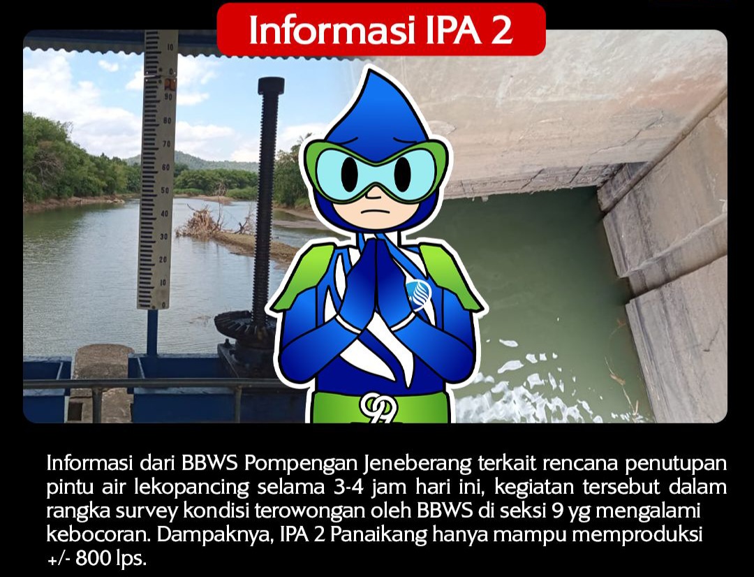 BN Online, Makassar-–Perumda Air Minum (PDAM) Kota Makassar mengumumkan adanya pengurangan pasokan air ke beberapa wilayah di kota akibat penutupan sementara pintu air Lekopancing yang dilakukan oleh Balai Besar Wilayah Sungai (BBWS) Pompengan Jeneberang. Penutupan ini berlangsung selama 3-4 jam pada hari ini, Senin (26/08/2024), untuk keperluan survei kondisi terowongan di Seksi 9 yang mengalami kebocoran.