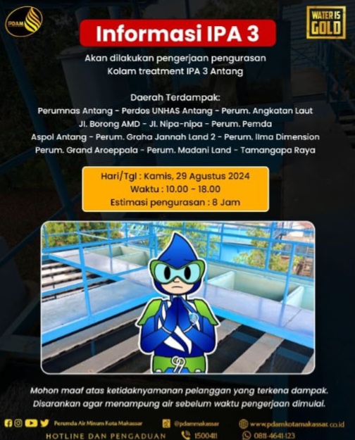 Rencananya, pengurasan kolam treatment IPA 3 Antang akan dilakukan Kamis (29/08/2024) pukul 10.00 – 18.00 Wita dengan estimasi pengurasan selama 8 jam.