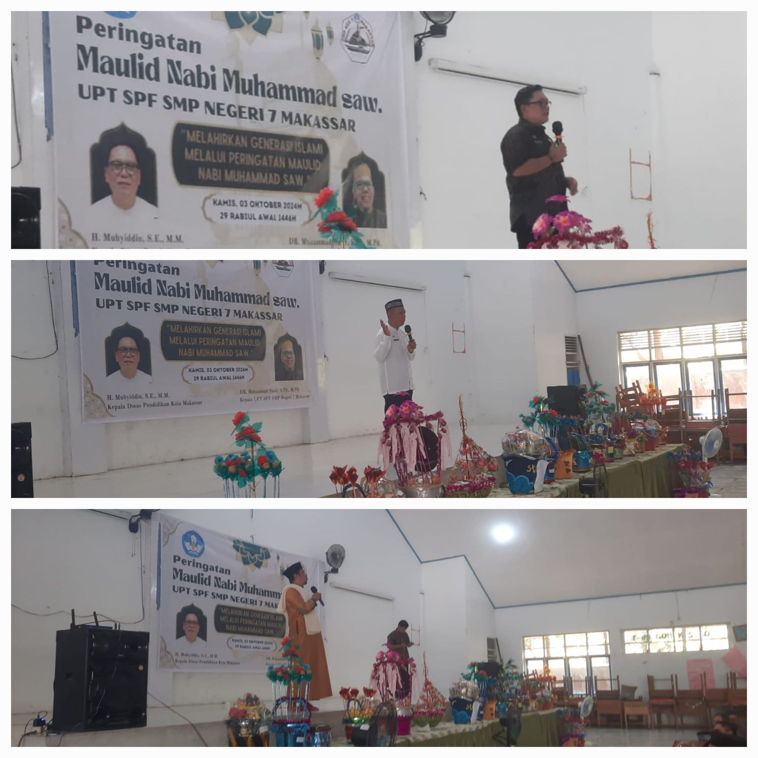 BN Onlime, Makassar-–UPT SPF SMP Negeri 7 yang terletak di Jalan Cakalang Kecamatan Ujung Tanah Kota Makassar menggelar Peringatan Maulid Nabi Muhammad SAW 1446 Hijriah, tahun ini menjadi momentum penting bagi siswa-siswi, guru, serta tamu undangan untuk merenungkan dan merayakan kehidupan serta ajaran luhur sang Rasul. Acara berlangsung meriah pada hari Kamis (03/10/2024), dengan tema “Melahirkan Generasi Islami Melalui Peringatan Maulid Nabi Muhammad SAW”