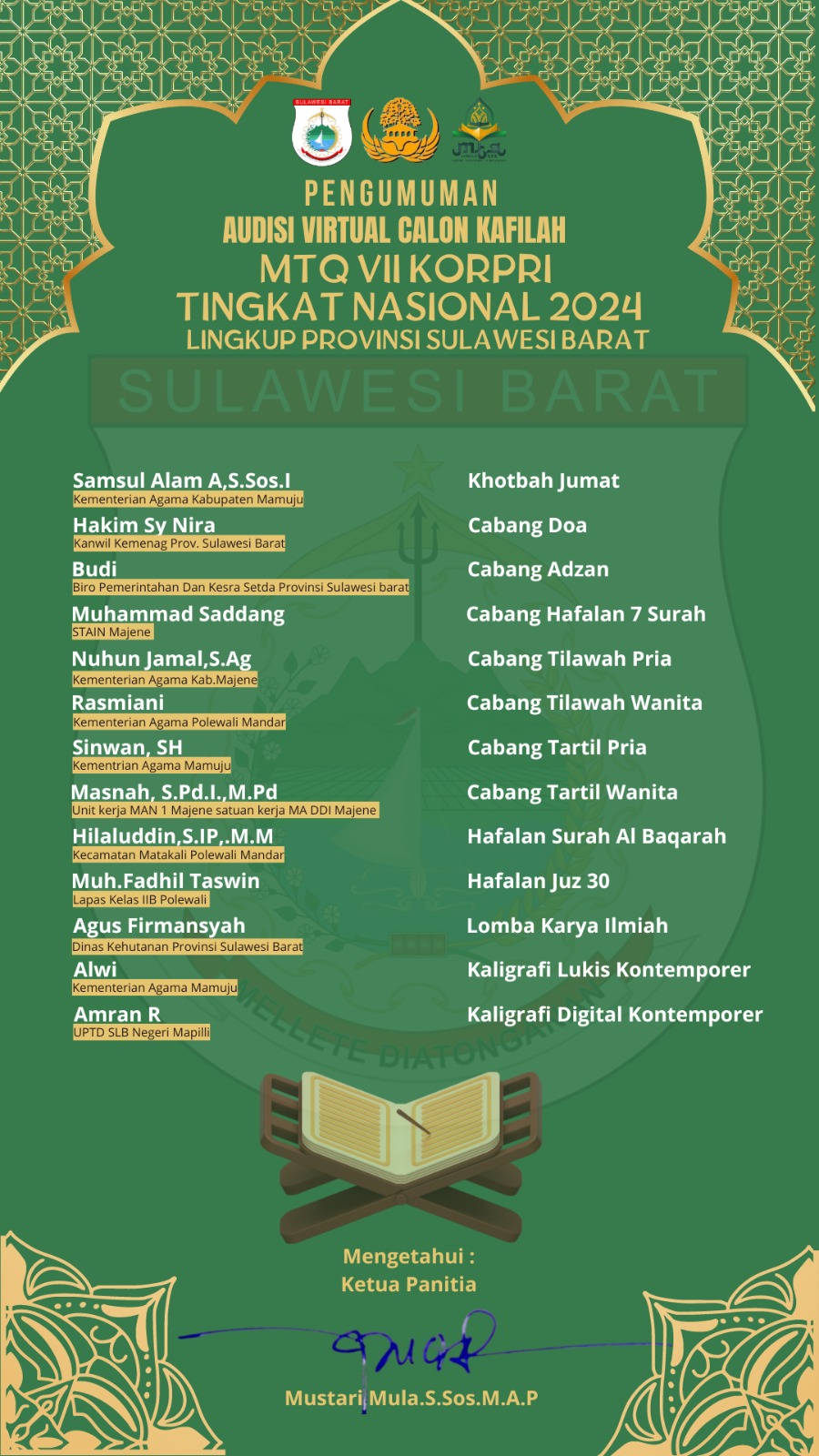 Adapun, 13 peserta yang lulus audisi kafilah MTQN VII tahun 2024 perwakilan Sulbar diantaranya: