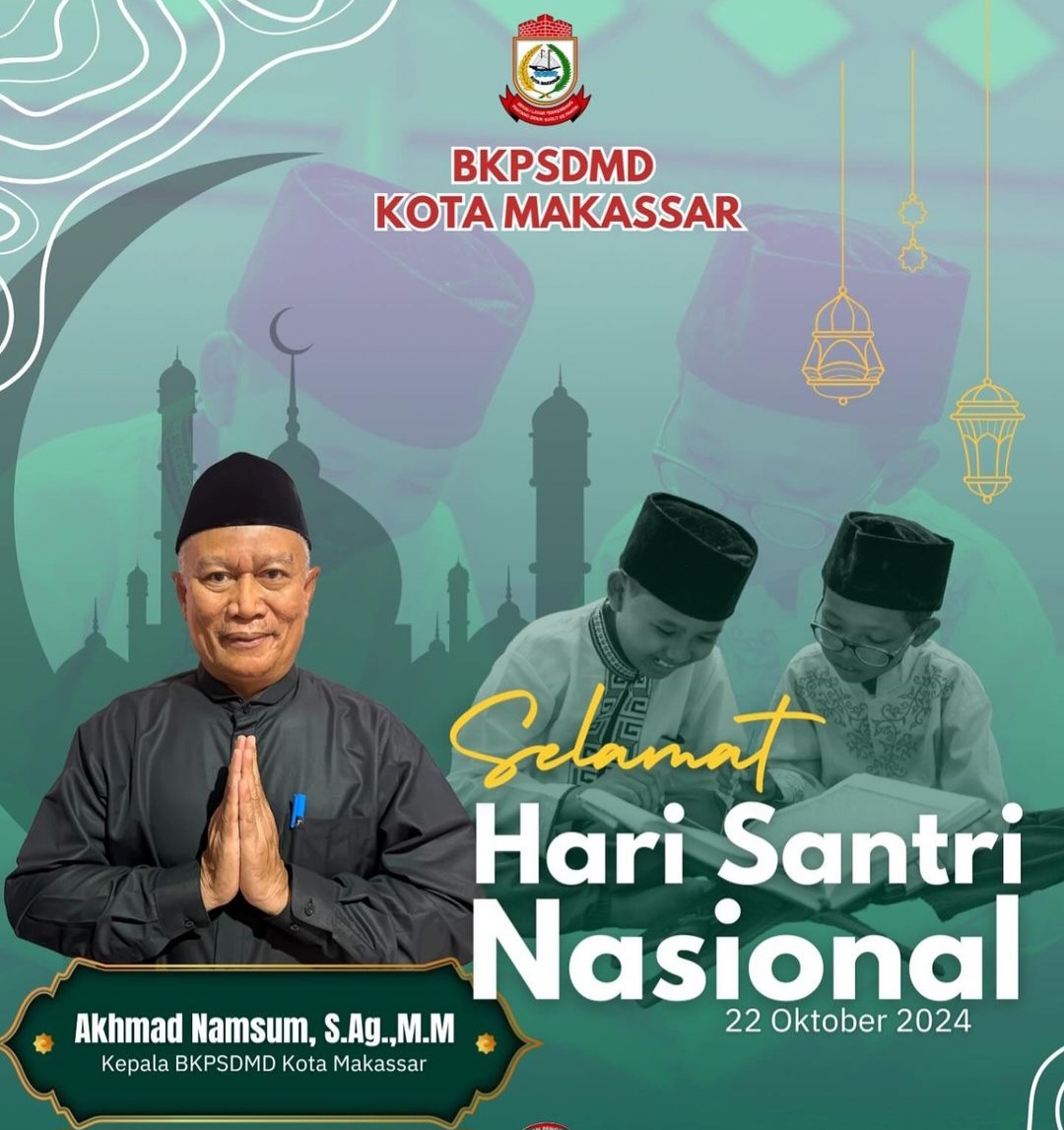 BN Online. Makassar,–Kepala Badan Kepegawaian dan Pengembangan Sumber Daya Manusia Daerah (BKPSDMD) Kota Makassar, Akhmad Namsum, S.Ag., M.M., mengucapkan Selamat Hari Santri Nasional kepada seluruh santri di Indonesia. Pada tahun ini, peringatan Hari Santri Nasional 2024 mengusung tema “Menyambung Juang, Merengkuh Masa Depan,” yang merefleksikan pentingnya meneruskan perjuangan para ulama dan santri terdahulu demi masa depan bangsa.
