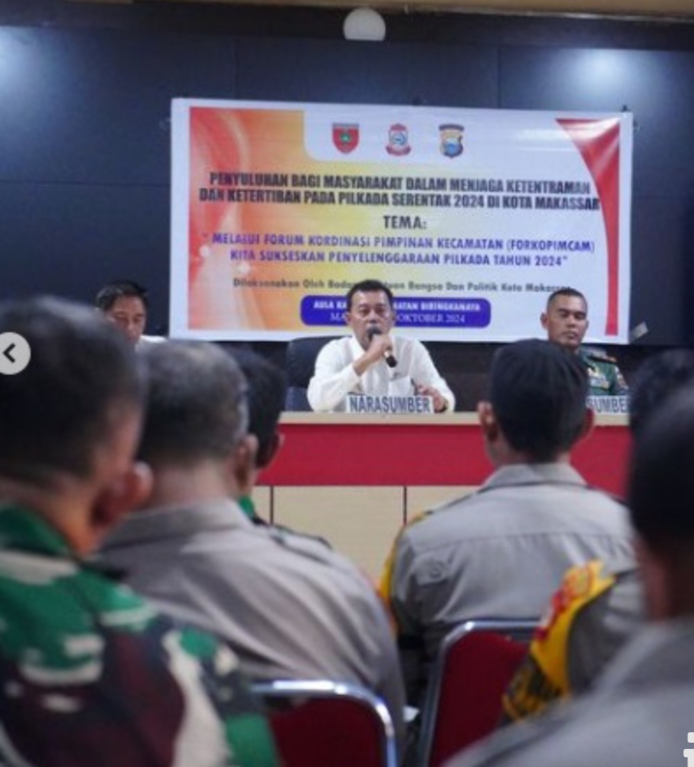 BN Online, Makassar – Camat Biringkanaya Juliaman menjadi narasumber dalam kegiatan penyuluhan bagi masyarakat dalam menjaga ketentraman dan ketertiban pada Pilkada Serentak 2024 di Kota Makassar.