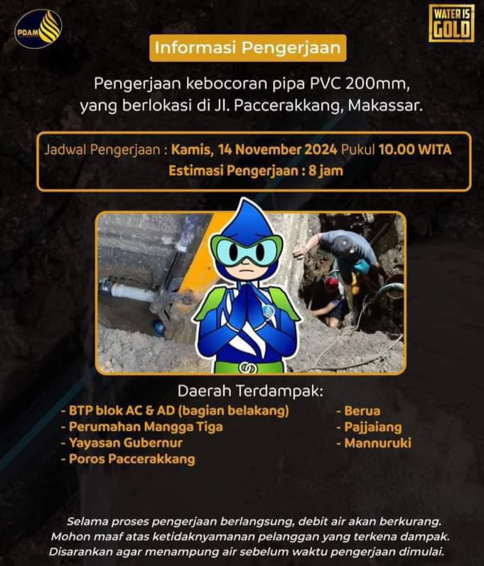 Rencananya, Perumda Air Minum Kota Makassar, Kamis (12/11/2024) akan melakukan pengerjaan mulai pukul 10.00 Wita, dengan estimasi waktu pengerjaan kurang lebih 8 jam.
