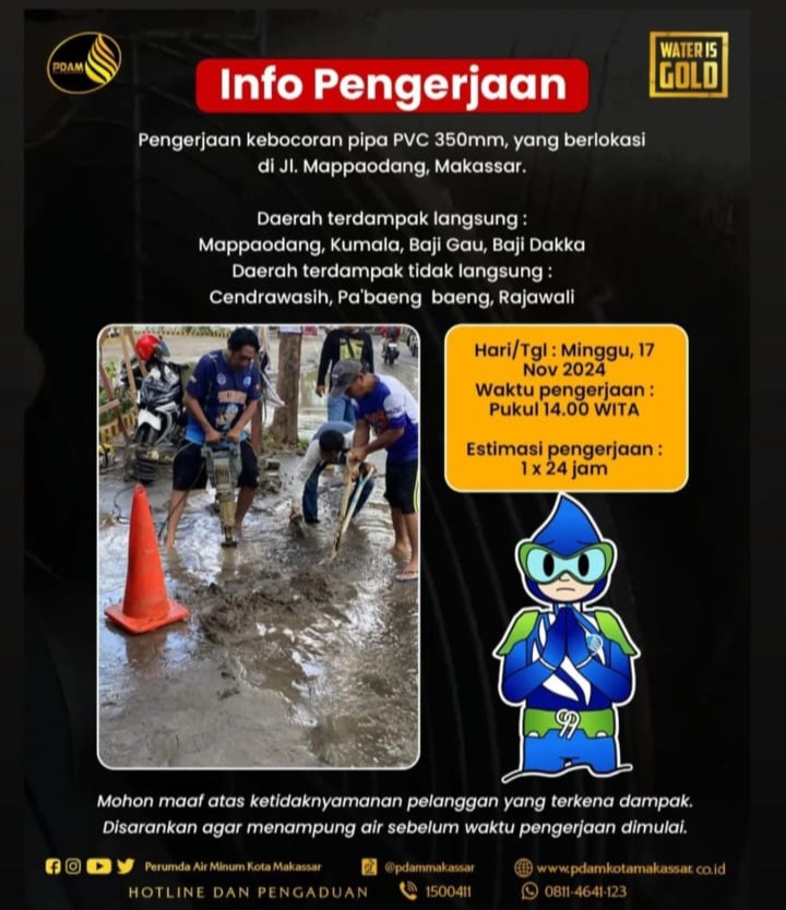 BN Online, Makassar–Perusahaan Umum Daerah Air Minum (PDAM) Kota Makassar mengumumkan terjadinya kebocoran pipa berdiameter 350 mm di Jalan Mappaodang. Kebocoran tersebut menyebabkan gangguan distribusi air di beberapa wilayah., Minggu 17 November 2024.