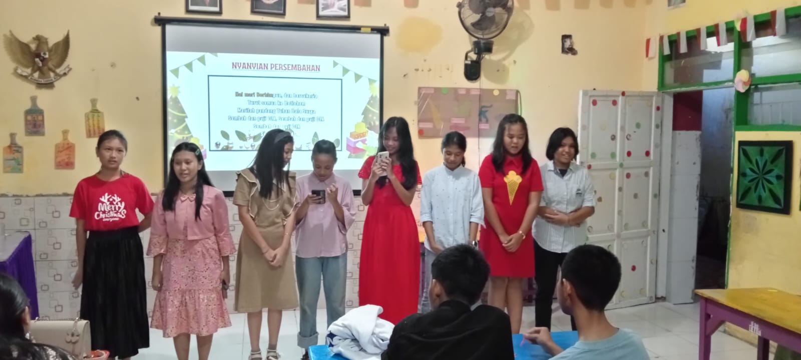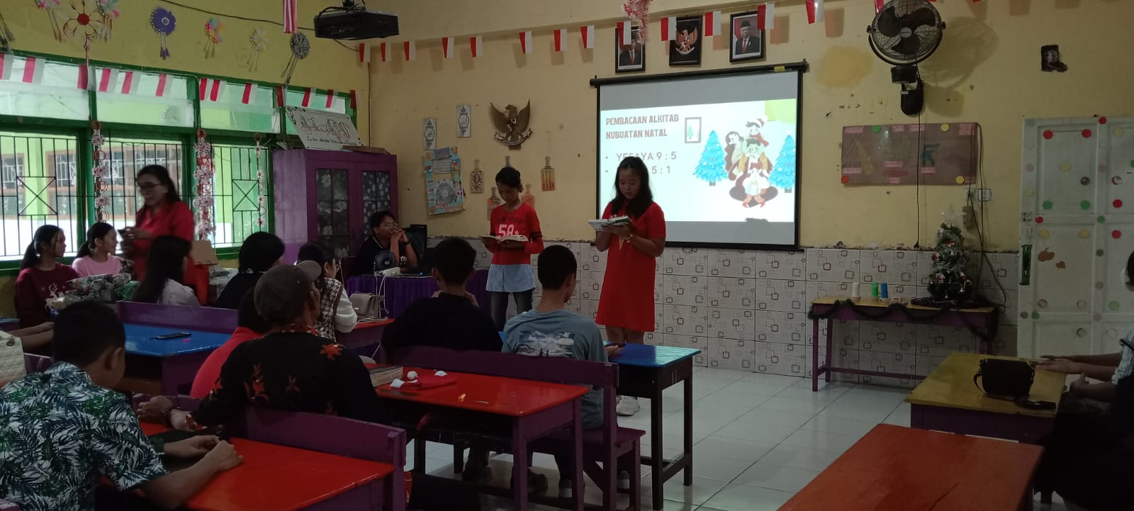 Setelah doa pembukaan dan pujian bersama, acara dilanjutkan dengan pembacaan Alkitab dari Lukas 2:8-16, yang menyampaikan pesan tentang kabar sukacita kelahiran Kristus kepada para gembala di padang. Suasana semakin meriah dengan penampilan duet vokal siswa kelas 7, 8, dan 9 yang menyanyikan lagu-lagu Natal, serta solo yang membangkitkan semangat dan rasa syukur akan kasih Kristus.