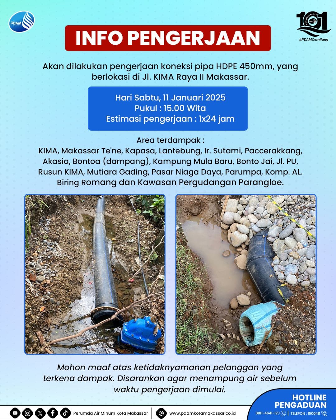 PDAM Makassar pun menyampaikan permohonan maaf kepada seluruh pelanggan yang terkena dampak pengerjaan. Tak lupa, PDAM Makassar juga menyarankan agar pelanggan menampung air sebelum waktu pengerjaan dimulai.