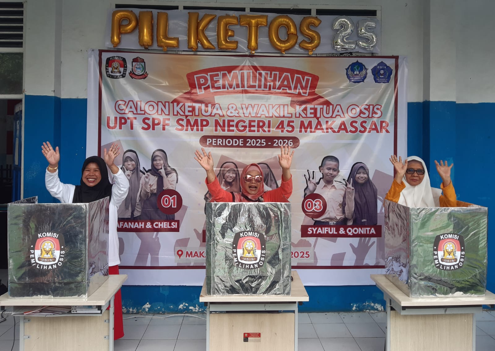 Dengan perolehan suara terbanyak, pasangan Syaifullah Usman dan Qonita Az Zahra resmi terpilih sebagai Ketua dan Wakil Ketua OSIS UPT SPF SMP Negeri 45 Makassar periode 2025-2026.