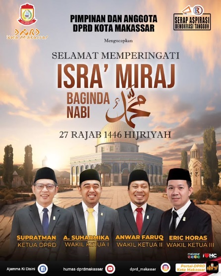BN Online, Makassar – DPRD Kota Makassar mengucapkan selamat memperingati Isra Miraj Nabi Muhammad SAW, 27 Rajab 1446 Hijriah, yang bertepatan pada hari ini, Senin (27/1/2025).