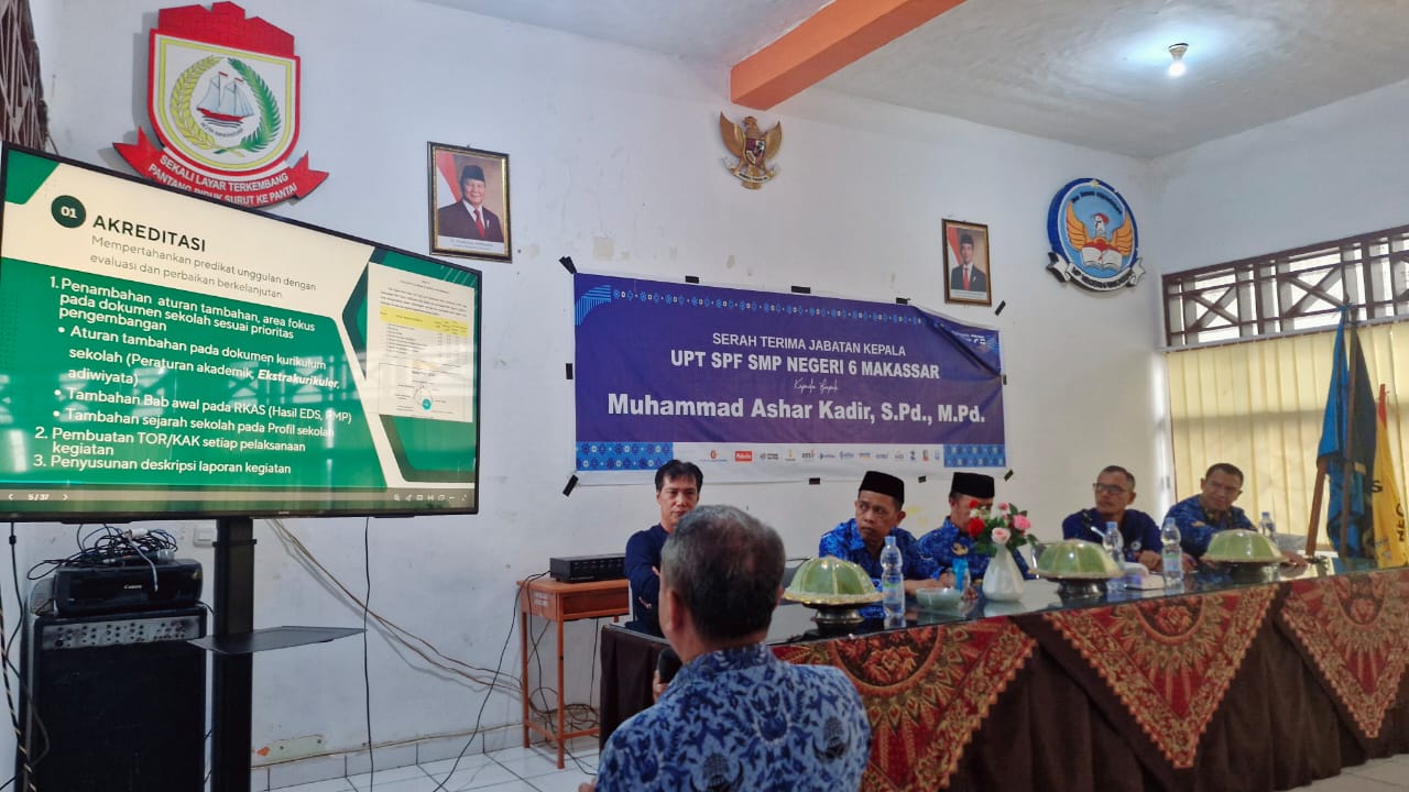 BN Online, Makassar––Bertempat di UPT SPF SMP Negeri 6 Makassar, digelar acara serah terima jabatan Kepala Unit Pelaksana Teknis (UPT) Satuan Pendidikan Formal (SPF) SMP Negeri 6 Makassar. Muhammad Ashar Kadir, S.Pd, M.Pd, yang sebelumnya menjabat sebagai Kepala UPT SPF SMP Negeri 24 Makassar, resmi menerima tongkat estafet kepemimpinan di UPT SPF SMP Negeri 6 Makassar.