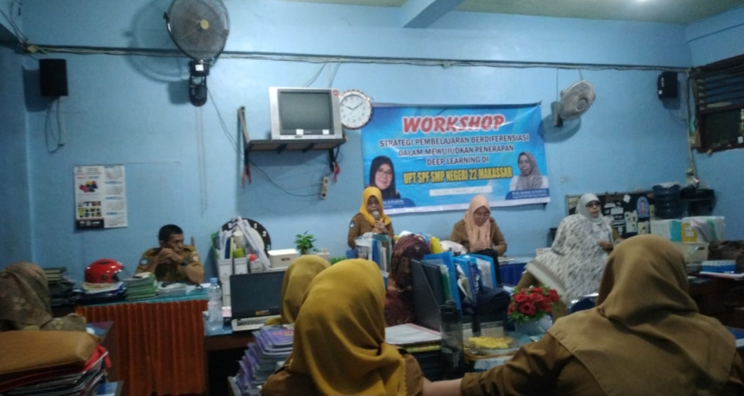 ĺBN Online, Makassar– UPT SPF SMPN 22 Makassar menggelar Workshop Strategi Pembelajaran Berdiferensiasi dalam upaya mendorong penerapan Deep Learning di lingkungan sekolah. Kegiatan ini dihadiri oleh para guru serta berbagai elemen sekolah yang berkomitmen untuk meningkatkan kualitas pembelajaran yang lebih adaptif dan inovatif.