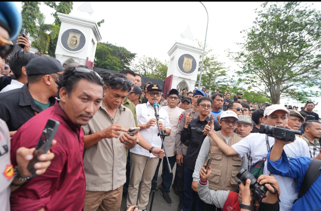 BN Online, Mamuju – Ratusan pendemo yang berunjuk rasa di depan kantor Gubernur Sulawesi Barat (Sulbar), ditemui langsung Gubernur Sulbar Suhardi Duka (SDK), Jumat 9 Mei 2025.