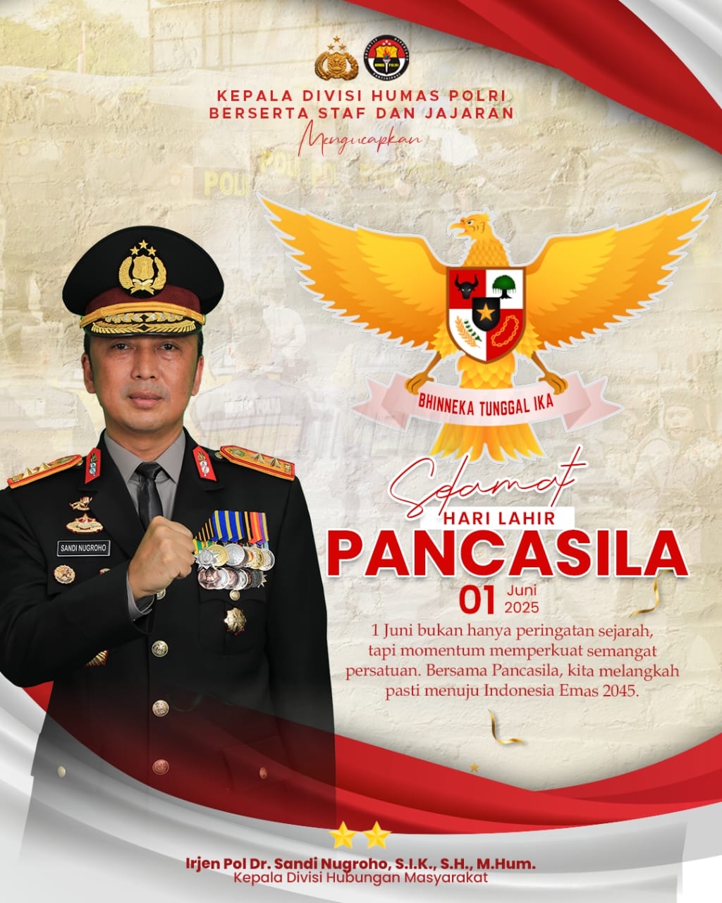 BN Online, Jakarta –Kepala Divisi Humas Polri, Irjen Pol. Dr. Sandi Nugroho, S.I.K., S.H., M.Hum., menyampaikan ucapan Selamat Hari Lahir Pancasila pada 1 Juni 2025. Menurutnya, hari ini bukan sekadar peringatan sejarah, melainkan momentum untuk memperkuat semangat persatuan bangsa.