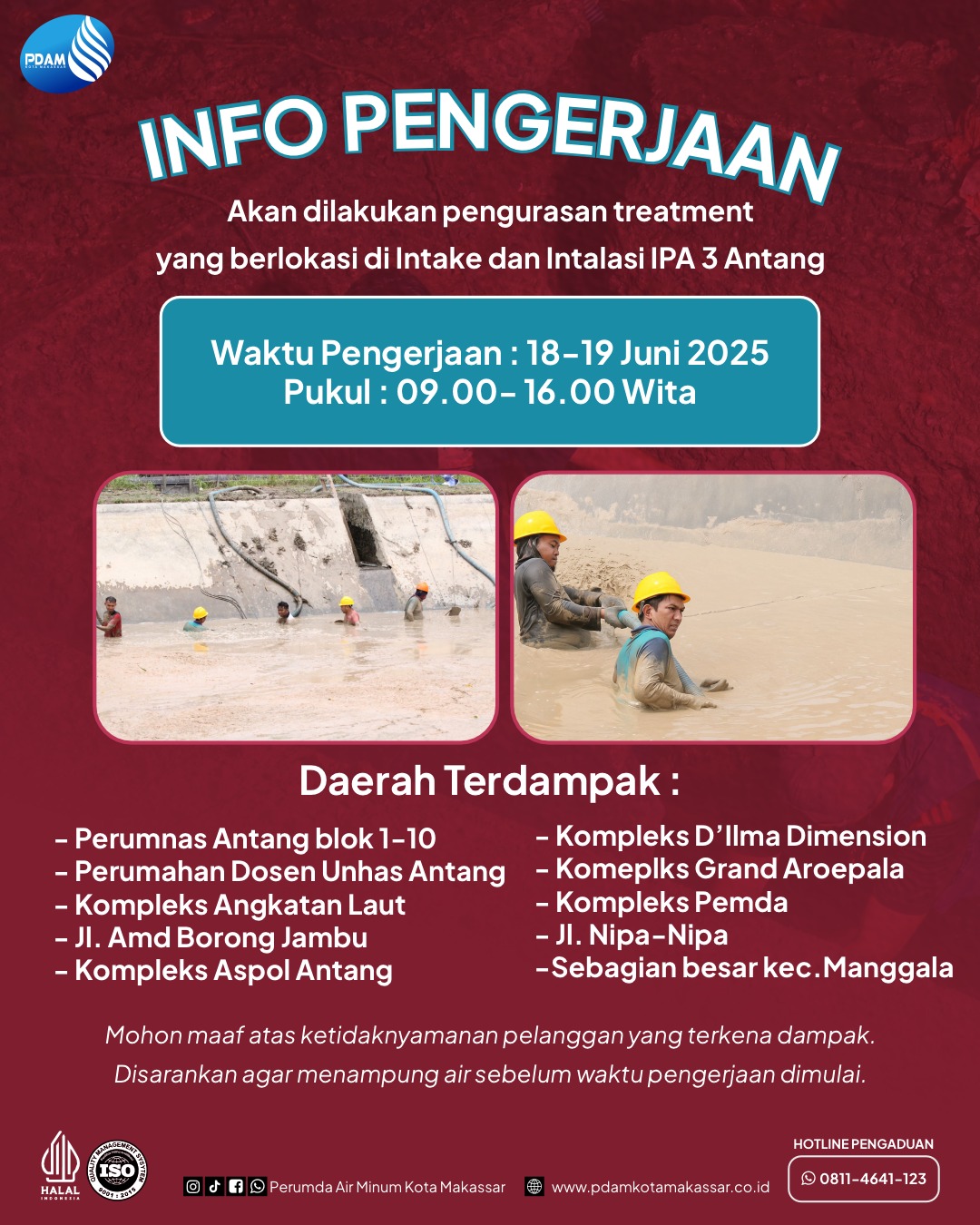 Kegiatan ini merupakan bagian dari pemeliharaan rutin guna menjamin kualitas dan kelancaran distribusi air bersih ke pelanggan. Namun, selama proses pengurasan berlangsung, akan terjadi gangguan aliran air ke sejumlah wilayah terdampak.
