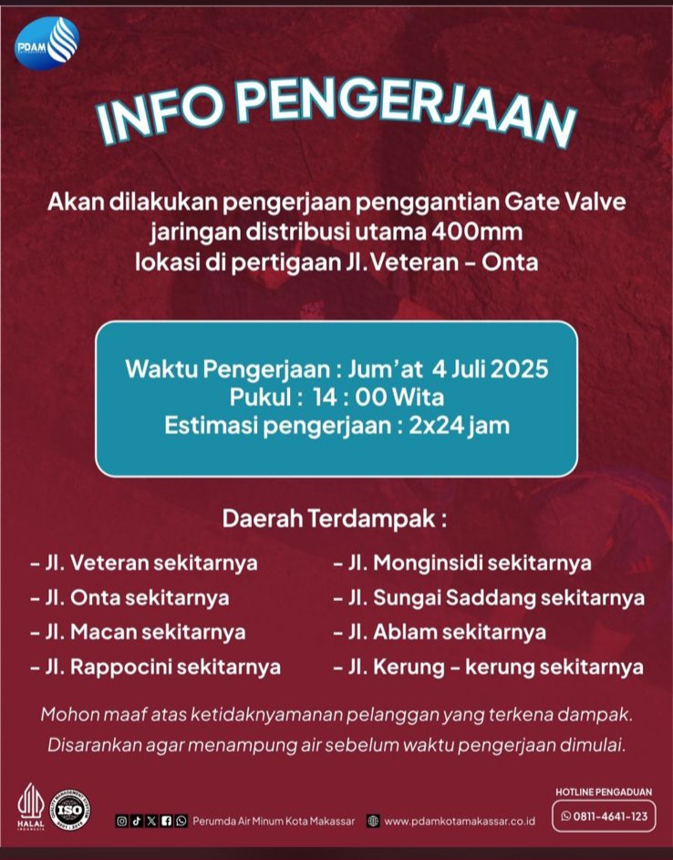 BN Online, Makassar– Perusahaan Umum Daerah (Perumda) Air Minum Kota Makassar akan melakukan pengerjaan penggantian gate valve pada jaringan distribusi utama berdiameter 400 mm yang berlokasi di pertigaan Jalan Veteran–Jalan Onta. Pengerjaan ini dijadwalkan dimulai pada Jumat, 4 Juli 2025 pukul 14.00 WITA, dengan estimasi waktu pengerjaan selama 2×24 jam.
