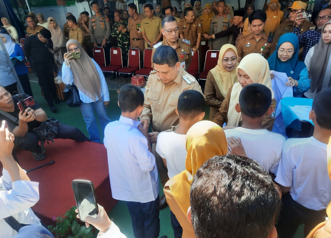 Dalam kesempatan tersebut, Wali Kota Munafri secara simbolis menyerahkan dua stel seragam utama—merah putih untuk siswa SD dan biru putih untuk siswa SMP.