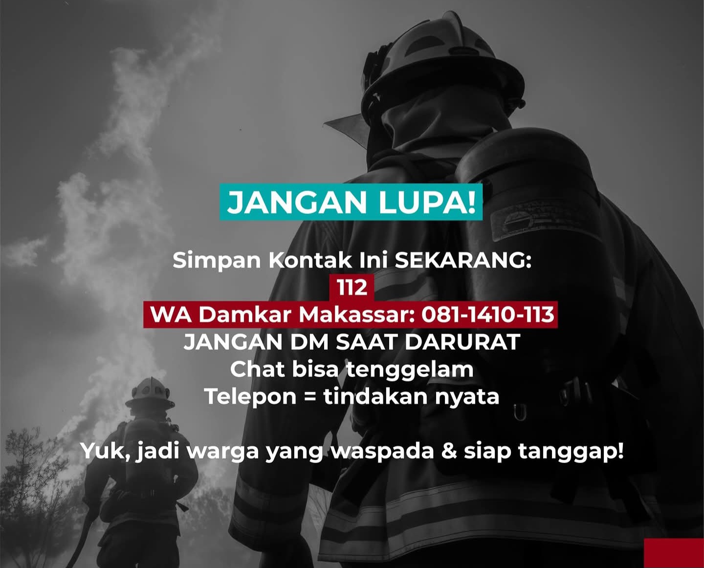 Simpan dua nomor penting ini sekarang: 112 (Panggilan darurat, gratis), 081-1410-113 (WhatsApp resmi Damkar Makassar)