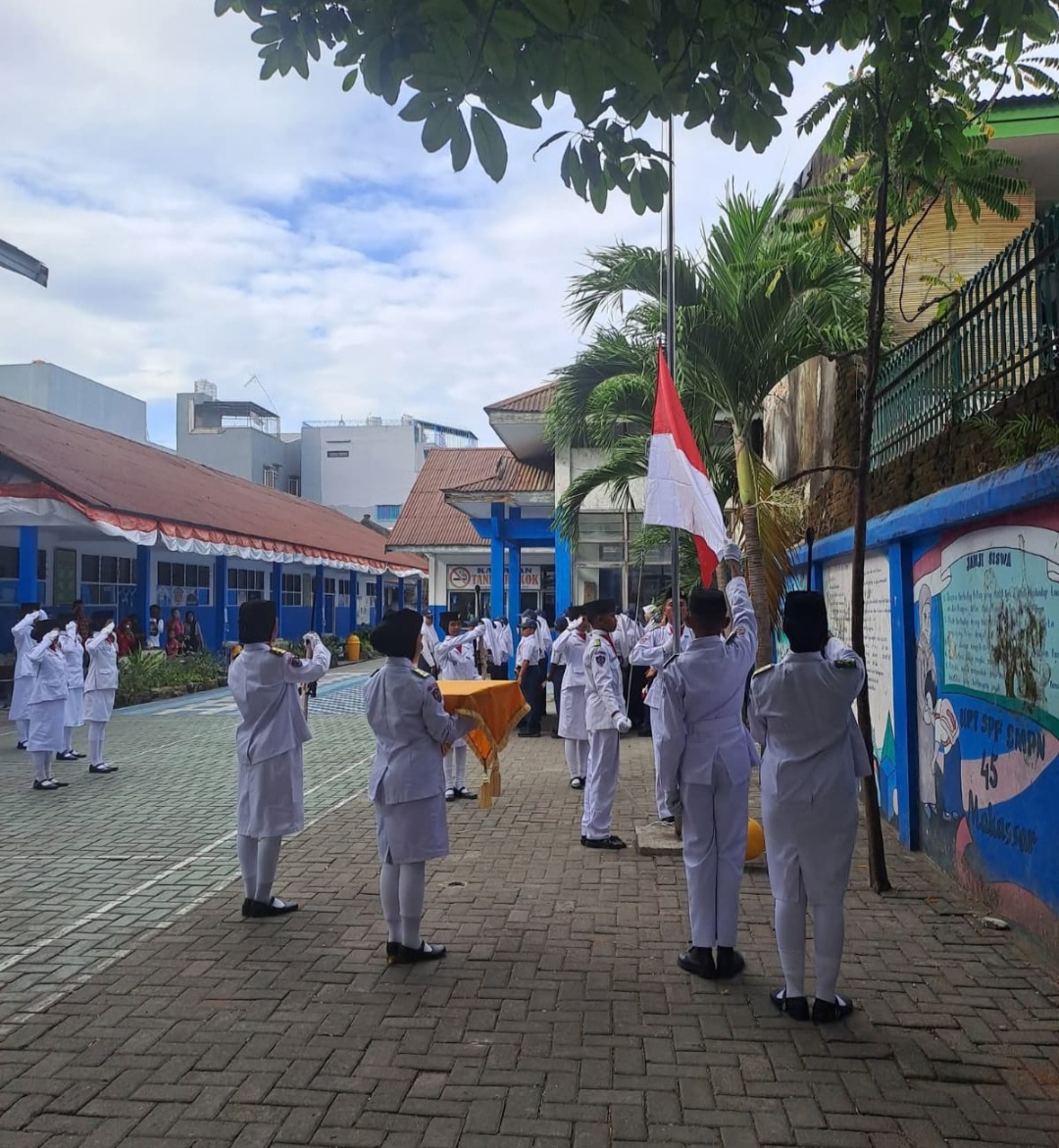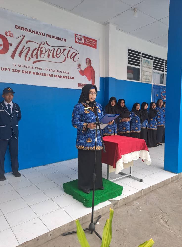 Kepala UPT SPF SMPN 45 Makassar, Hj. Hamriah, S.Pd., M.Pd., dalam sambutannya menyampaikan bahwa momentum kemerdekaan harus dimaknai sebagai ruang untuk menumbuhkan semangat kebersamaan, kedisiplinan, serta tanggung jawab generasi muda dalam menjaga persatuan bangsa.