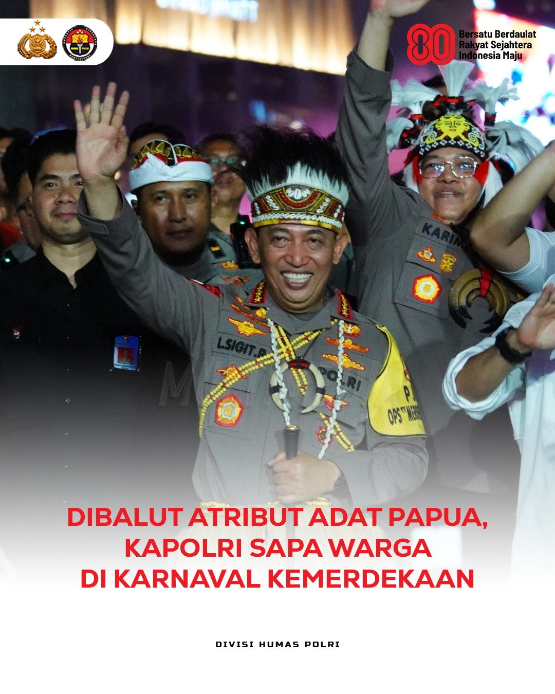 Tampil berbeda dari biasanya, Kapolri mengenakan seragam lengkap Kepolisian yang dipadukan dengan atribut adat Papua. Penutup kepala berbulu khas Papua, kalung etnik, hingga rok rumbai yang dikenakannya menjadi sorotan dan ikon tersendiri dalam Karnaval Kemerdekaan tahun ini.