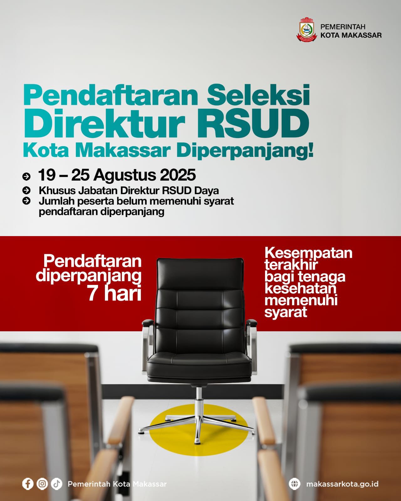 Kesempatan ini menjadi peluang terakhir bagi para tenaga kesehatan yang memenuhi kriteria untuk turut serta memimpin salah satu rumah sakit kebanggaan Kota Makassar.