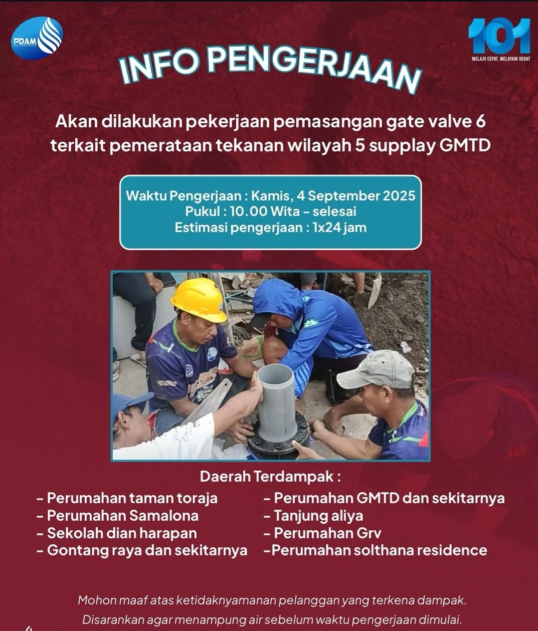 BN Online, Makassar – Perusahaan Daerah Air Minum (PDAM) Kota Makassar kembali menyampaikan informasi terkait rencana pekerjaan teknis berupa pemasangan Gate Valve 6 dalam rangka pemerataan tekanan air di wilayah 5 Supply GMTD.