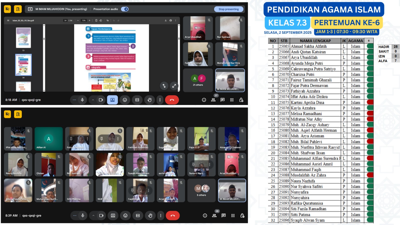 Proses belajar mengajar dilakukan melalui perangkat gawai (HP) yang dimiliki siswa. Kehadiran dan partisipasi peserta didik dipantau langsung oleh masing-masing wali kelas melalui aplikasi pembelajaran yang digunakan.
