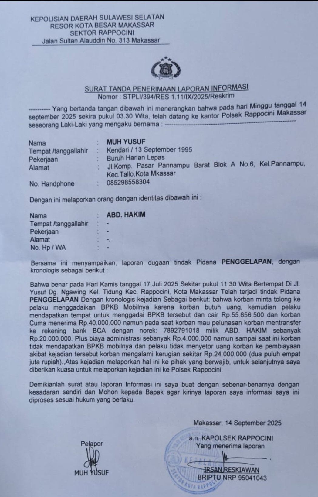 Merasa dirugikan, Yusuf akhirnya melaporkan kasus tersebut ke Polsek Rappocini dengan nomor laporan STPLI/394/RES 1.11/IX/2025/Reskrim pada Minggu (14/9/2025). Ia menilai kasus ini sebagai tindak penggelapan dana dengan kerugian mencapai Rp45,26 juta.