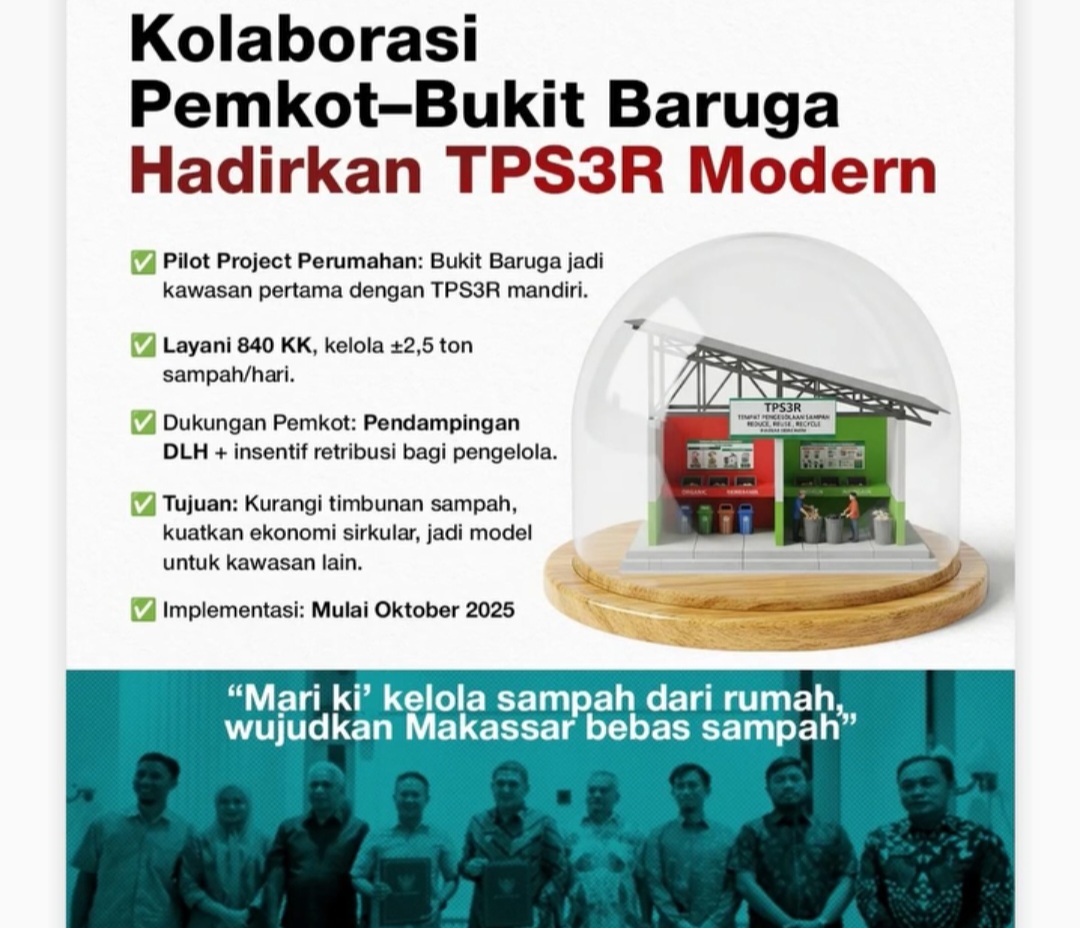 BN Online, Makassar— Dinas Komunikasi dan Informatika (Diskominfo) Kota Makassar mengumumkan kolaborasi bersama Pemerintah Kota (Pemkot) Baruga dalam menghadirkan Tempat Pengolahan Sampah Reduce-Reuse-Recycle (TPS3R) modern. Pilot project ini resmi ditetapkan di kawasan Perumahan Bukit Baruga, yang menjadi kawasan pertama di Makassar dengan fasilitas TPS3R mandiri, Jumat 19 September 2025.