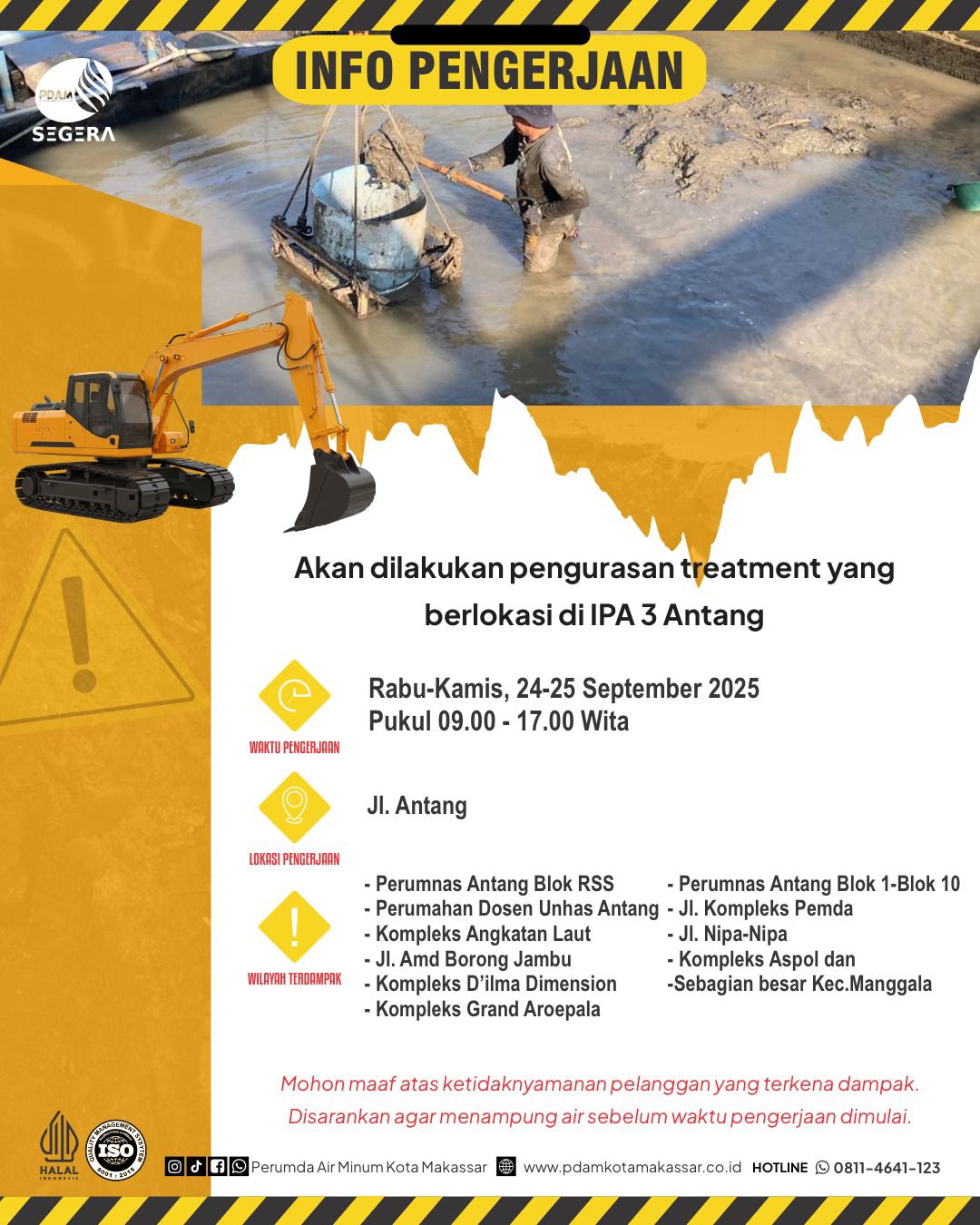 BN Online, Makassar — Perumda Air Minum Kota Makassar akan melakukan pengurasan treatment di Instalasi Pengolahan Air (IPA) 3 Antang pada Rabu-Kamis, 24–25 September 2025, mulai pukul 09.00 hingga 17.00 WITA. Pengerjaan ini diperkirakan berdampak pada suplai air bersih di sejumlah kawasan.