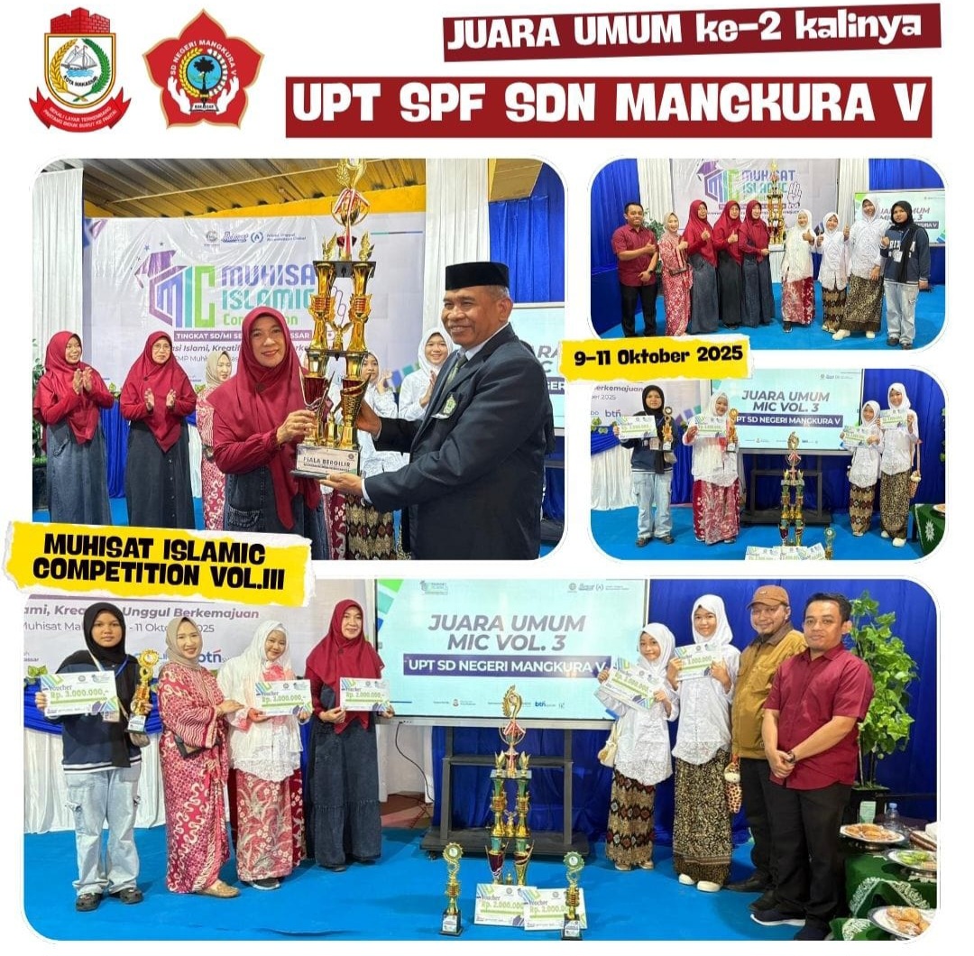 BN Online, Makassar— UPT SPF SD Negeri Mangkura V Makassar kembali menorehkan prestasi gemilang dengan berhasil meraih Juara Umum untuk kedua kalinya secara berturut-turut pada ajang MUHISAT ISLAMIC COMPETITION VOL. III, yang diselenggarakan oleh SMP Muhammadiyah 1 (MUHISAT) Makassar pada tanggal 9–11 Oktober 2025.