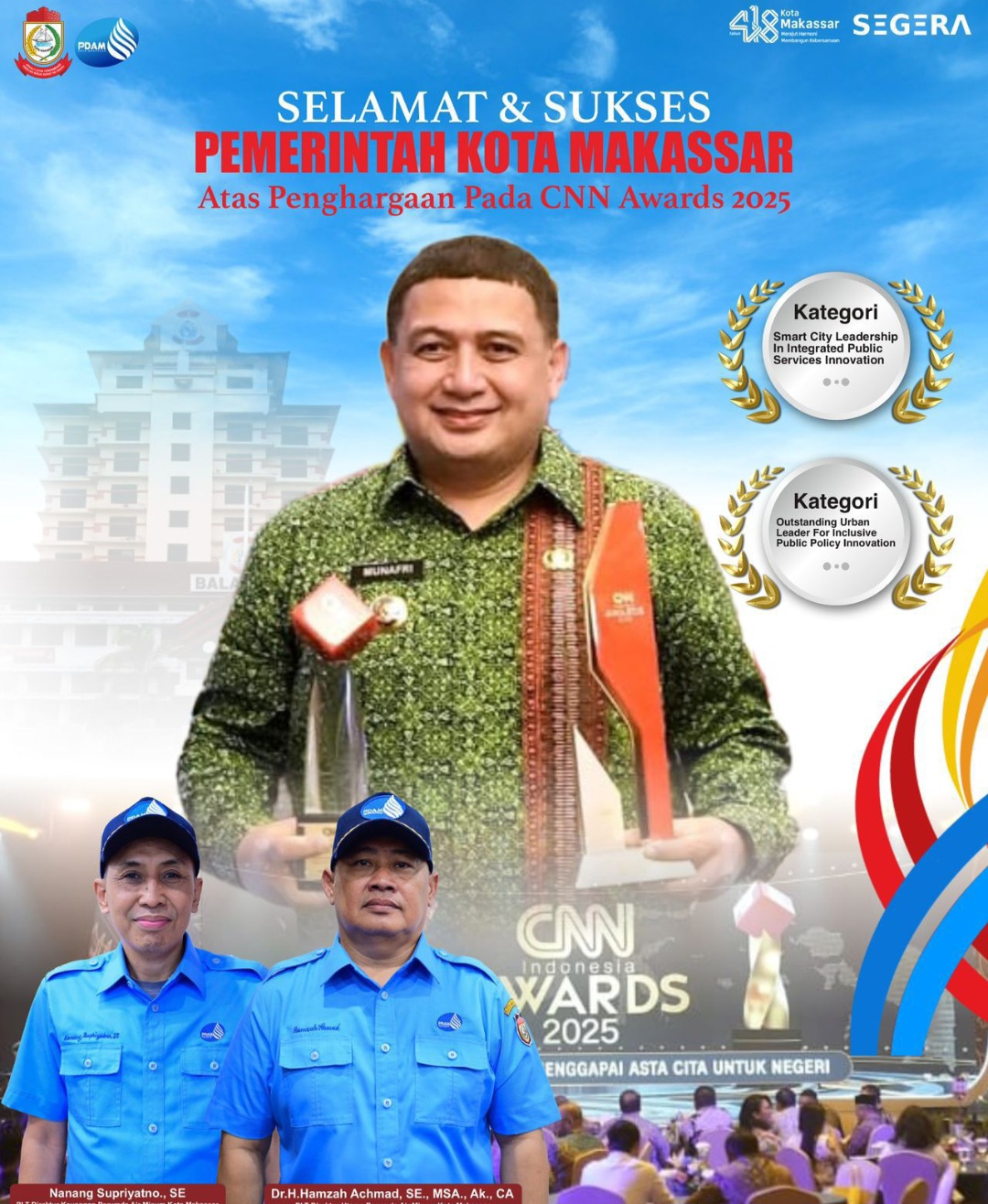 BN Online, Makassar —¹¹Plt. Direktur Utama Perumda Air Minum Kota Makassar, Hamzah Ahmad, menyampaikan ucapan selamat dan sukses kepada Pemerintah Kota Makassar di bawah kepemimpinan Wali Kota Munafri Arifuddin dan Wakil Wali Kota Aliyah Mustika Ilham, yang terus menghadirkan berbagai kebijakan publik berpihak pada masyarakat dan mendorong kemajuan inklusif.