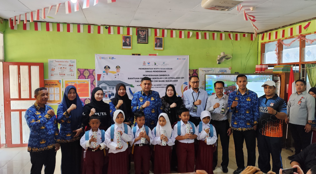 BN Online, Makassar — Kegiatan penyerahan simbolis bantuan seragam sekolah dari program Corporate Social Responsibility (CSR) Citraland City Makassar serta bantuan tas dan tumbler dari CSR Bank Sulselbar berlangsung di Kompleks UPT SPF SD Inpres Cambaya Tallo, Senin (17/11/2025).