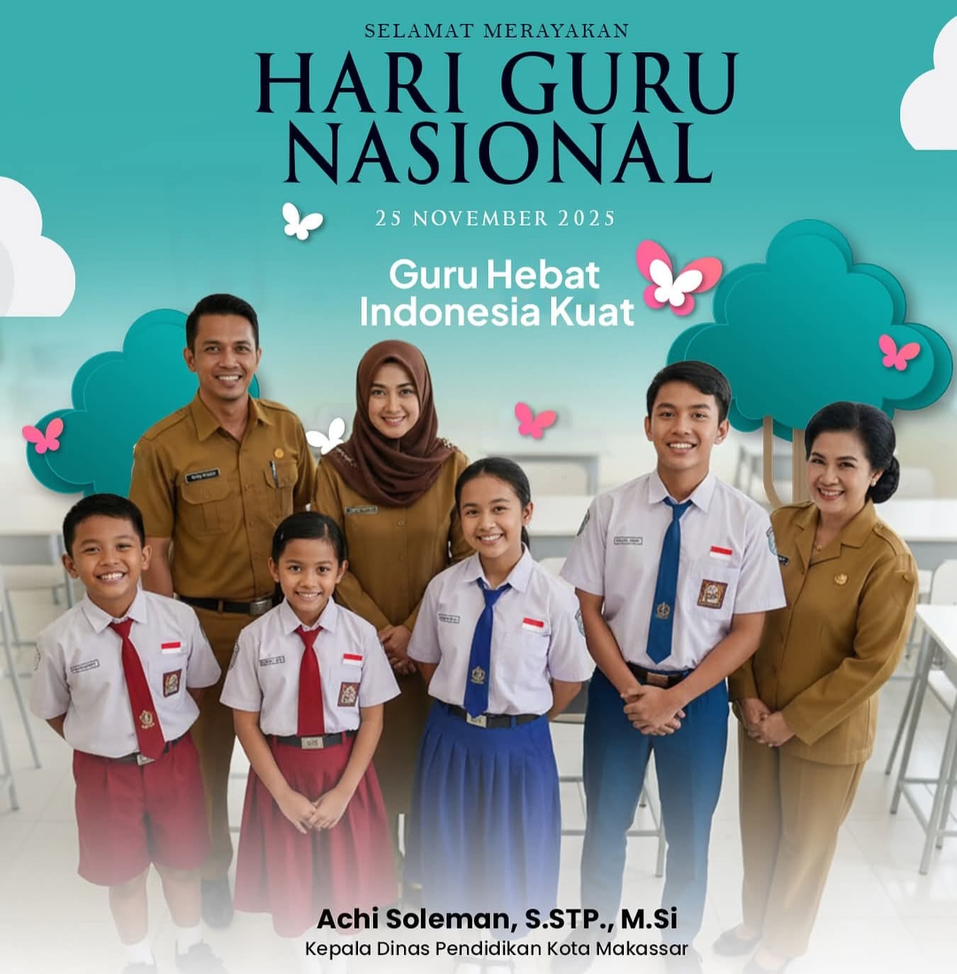 BN Online, Makassar—Kepala Dinas Pendidikan Kota Makassar, Achy Soleman, S. STP, M.Si, menyampaikan ucapan selamat Hari Guru Nasional 2025 melalui unggahan resmi media sosial Dinas Pendidikan Kota Makassar, Selasa (25/11/2025).