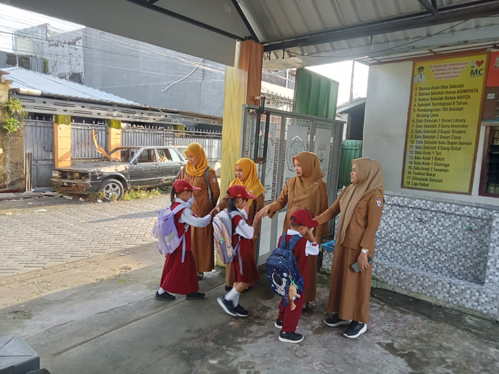 Kegiatan yang telah menjadi program rutin ini dimulai sejak pukul 07.00 WITA. Dengan ramah, para guru menyambut kedatangan siswa, membantu mereka turun dari kendaraan, serta memastikan mereka siap mengikuti proses belajar mengajar. Tak hanya sekadar menyapa, para guru juga memanfaatkan momen tersebut untuk mengecek kesiapan belajar anak-anak, seperti kerapian seragam dan perlengkapan sekolah.