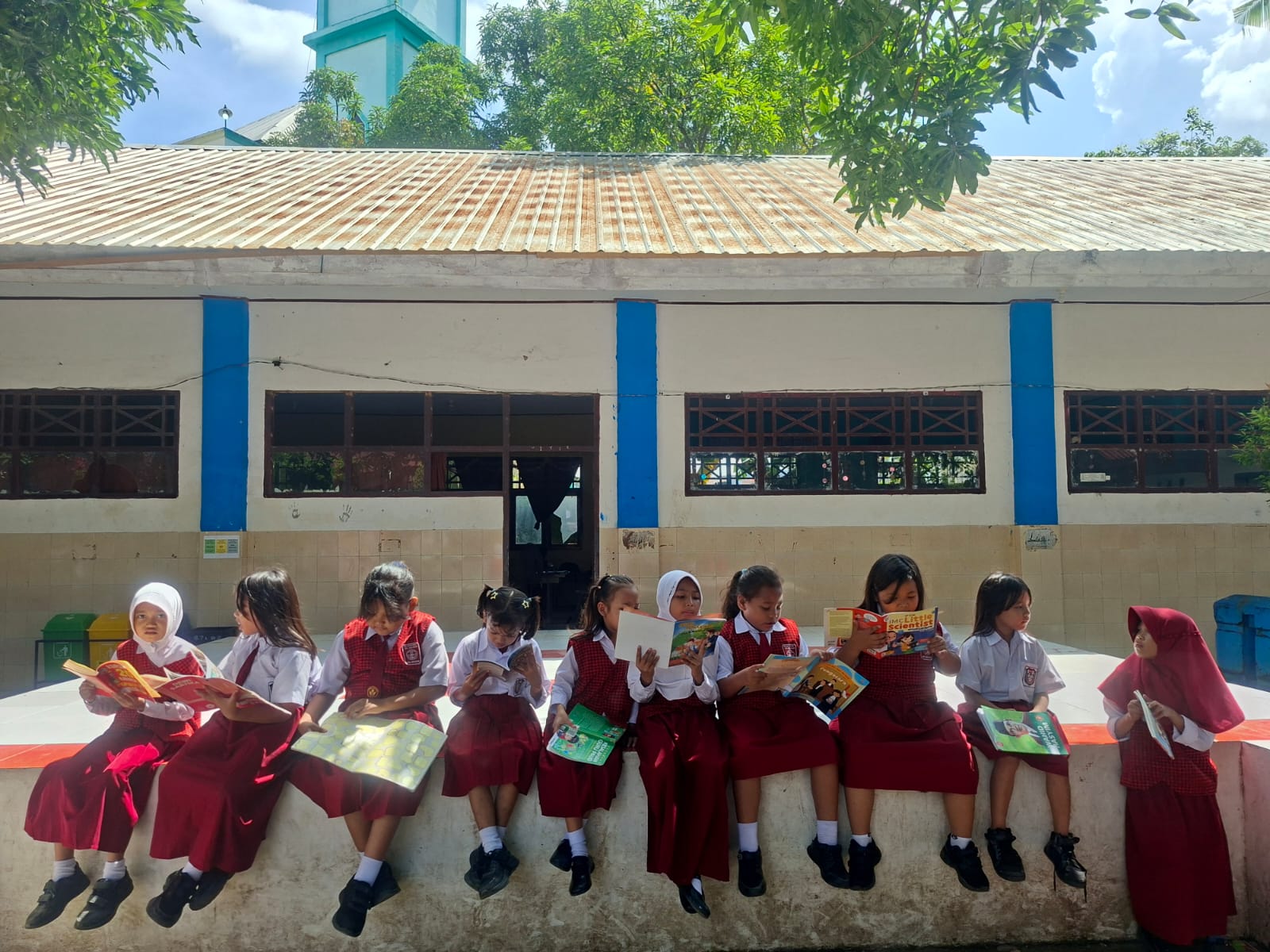 Siswa sangat antusias memilih buku cerita yang penuh dengan variasi gambar yang menarik. Beragam koleksi buku anak, cerita bergambar, hingga bacaan edukatif menjadi daya tarik tersendiri bagi para murid. Suasana halaman sekolah pun terlihat ramai dan penuh keceriaan saat siswa membaca buku secara mandiri maupun bersama teman-temannya.