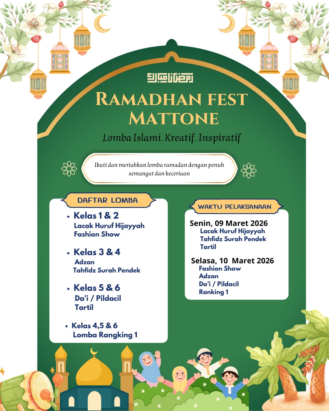 Selain itu, panitia telah menyusun jadwal pelaksanaan lomba secara terperinci. Pada hari pertama, Senin, 9 Maret 2026, akan digelar lomba Lacak Huruf Hijaiyah, Tahfidz Surah Pendek, dan Tartil. Kemudian di hari kedua, Selasa, 10 Maret 2026, rangkaian acara dilanjutkan dengan lomba Fashion Show, Adzan, Da’i/Pildacil, dan puncaknya Lomba Ranking 1 yang akan menguji wawasan keislaman para peserta.
